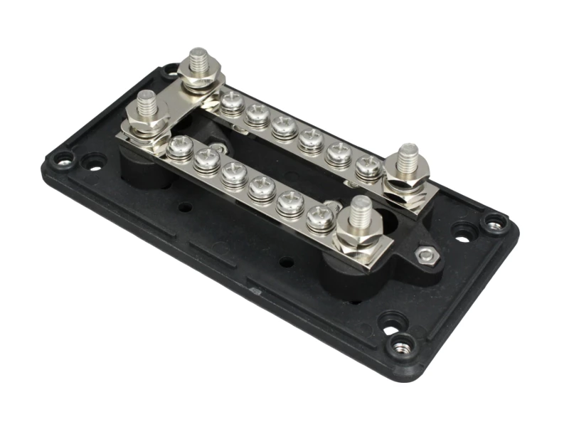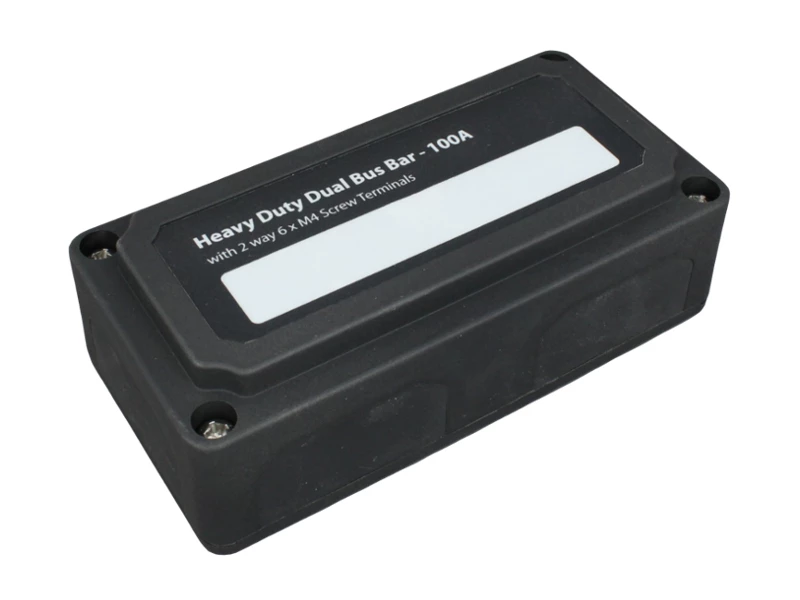 A superbly designed and constructed 100A dual busbar terminal box. This heavy duty enclosure is extremely rugged and well protected and contains twin 6-way busbars with 4mm screw terminals for power distribution and four 6mm stud terminals for the main power connections. The two busbars can be commoned using the linking bar to provide 12-terminals in total, or the bar can be removed if, for example, you want to distribute power on one busbar and consolidate ground connections on the other.