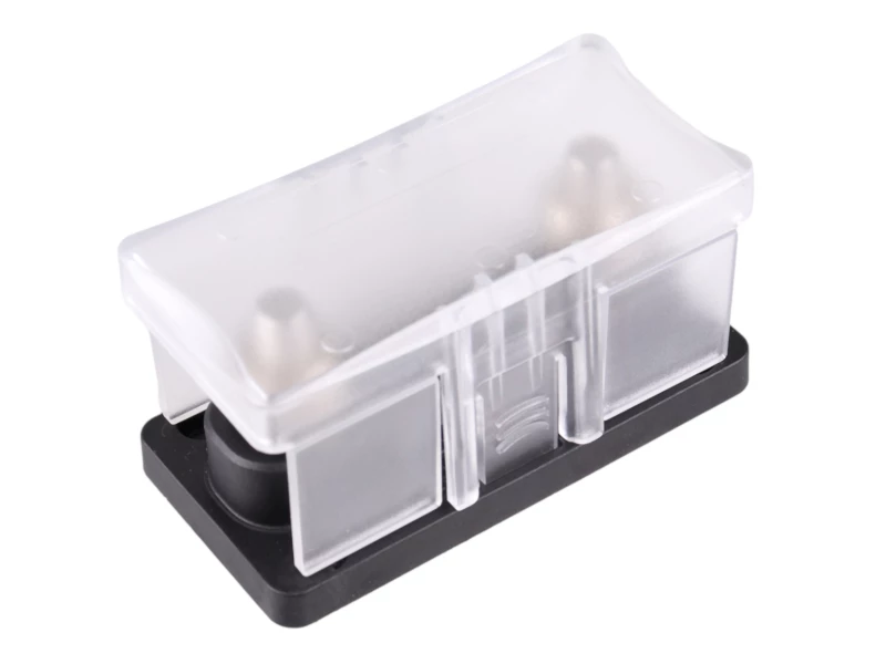 Rugged single fuse holder with clear cover for use with ANL fuses to protect high current circuits in cars, campervans, motorhomes, boats and off-grid applications.