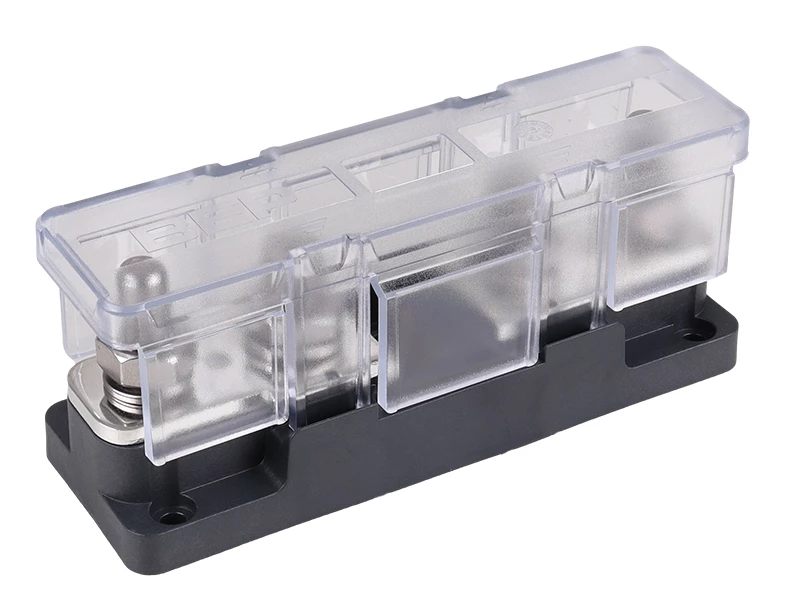 This holder has tinned copper conductors and stainless steel fixing hardware for corrosion-resistance in marine environments, and comes with a clear lid to insulate and protect the fuse connections.