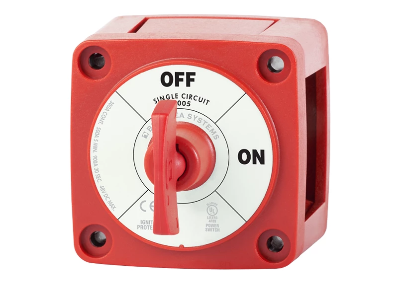 This m-Series 6005 mini On/Off battery switch from Blue Sea Systems switches a single battery (or bank of batteries) to a single load group and is suitable for use with systems up to 48V DC. It offers a continuous rating of 300A, an intermittent rating of 500A (5 min) and a cranking rating of 900A (5 sec).