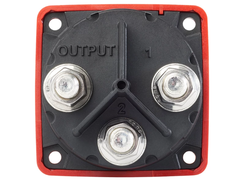 This m-Series 6008 3 position mini battery selector switch from Blue Sea Systems switches between two battery banks to supply all loads (or receive charge) and is suitable for use with systems up to 32V DC. It offers a continuous rating of 300A, an intermittent rating of 500A (5 min) and a cranking rating of 900A (5 sec).
