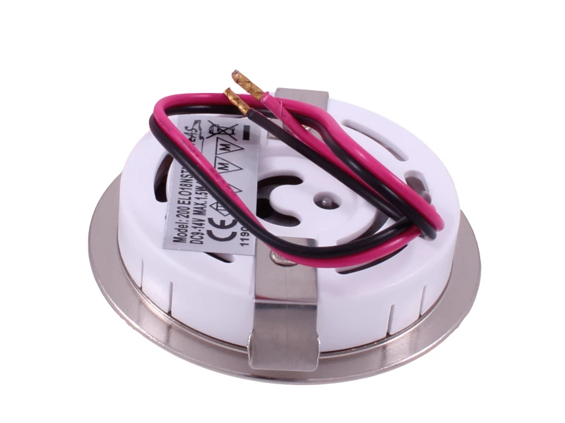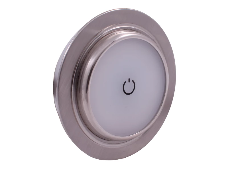 Dimatec recessed 12V downlight with 15 surface mounted LEDs (1.2W). This 65mm diameter flush fitting, recessed light has a nickel finish and a warm white light output with an opaque lens to soften and diffuse the light. This light can be turned on and off by touching the centre of the light and the unit tilts within the housing, enabling you to direct the light through 360º