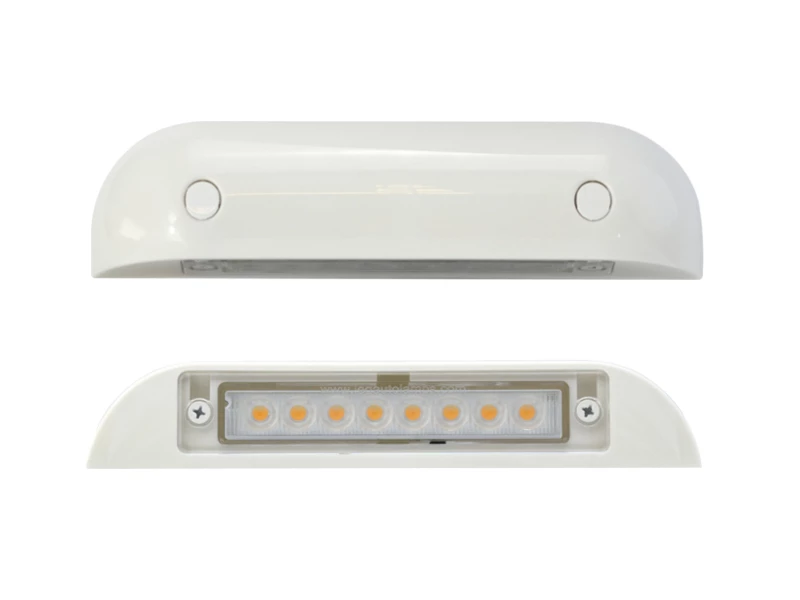 The LED Autolamps door entry scene light is a surface-mounted, exterior 12v LED unit designed for installation above the door of a motorhome, horsebox or trailer to provide entrance lighting. The light is fully waterproof (IP67), 186mm long and features 8 high brightness LEDs with a warm white light output. The housing is angled at approx. 30º to create a downward wash of light which also makes is also makes it suitable for illuminating lockers, shelves etc.