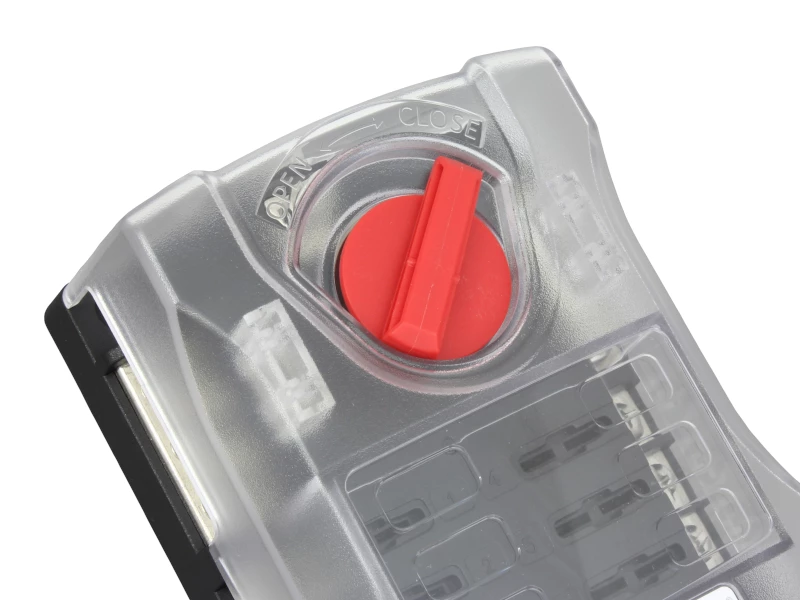 6 way version of our popular fuse box comprising 2 independent positive busbars (e.g. for 1 permanent live busbar and 1 ignition-switched busbar) and 1 negative busbar: