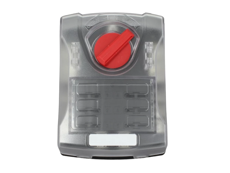 The cover is secured via a sprung rotary locking mechanism and incorporates two slots for storing spare fuses and moulded-in recesses to affix labels for circuit ID. The base contains 4 fixing holes for mounting the fuse box to a flat surface.
