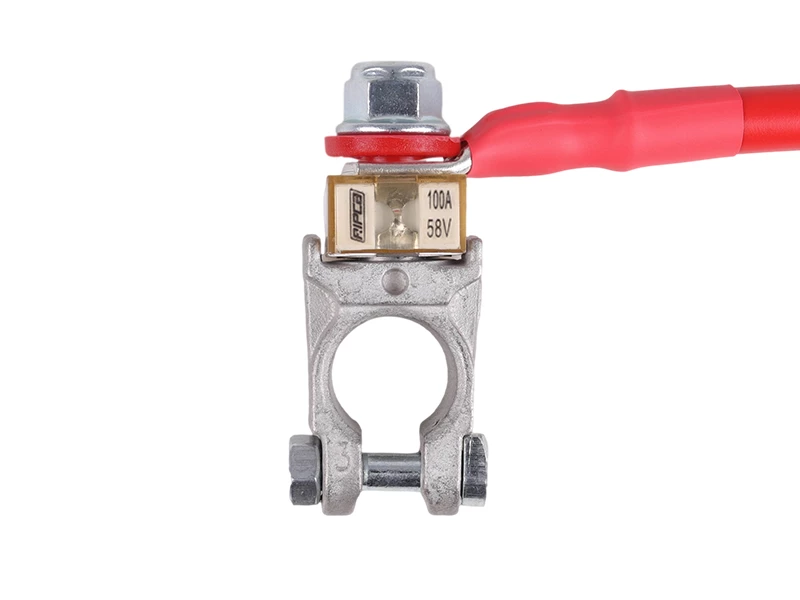 Special terminal clamp for use with ceramic cube fuses with a single connection point that fits the positive battery post. This fusing arrangement eliminates any unprotected section of the cable coming from the battery, giving you maximum protection for your circuits.
