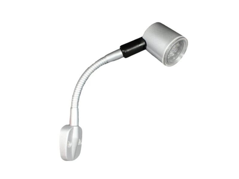 Kurs 12V LED flexible reading light (light output equivalent to an 8W halogen bulb) for use in motorhomes, vans, campervans, caravans, boats etc. Finished in matt silver with a 130mm flexible arm, this reading light has an integrated on/off switch and a tilt and swivel head (tilt 90° swivel 300°). This is a really nice looking light and ideal for use over sleeping areas or chart tables.