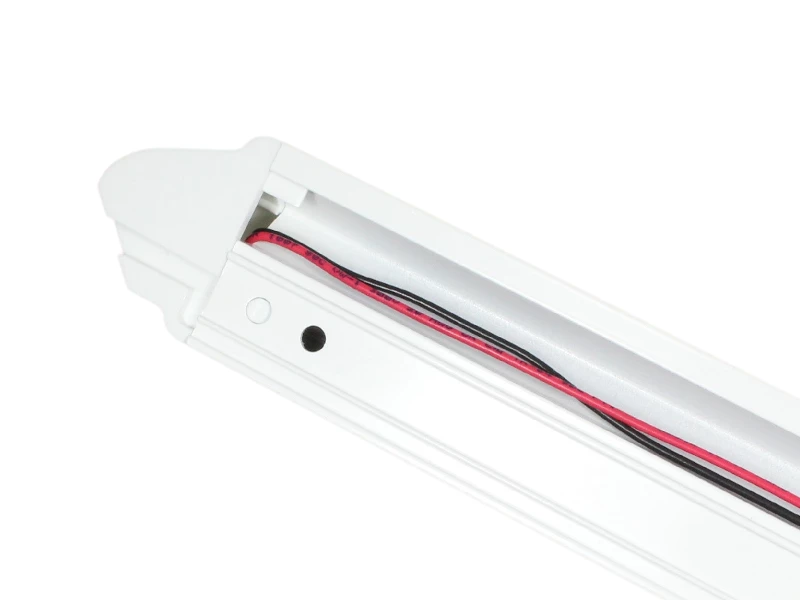 The housing has removable plastic end caps to access the fixing holes. Termination is via flying leads (+ve to red, -ve to black) and the LED strip can be turned around in the housing so that the flying leads exit from either left or the right hand end. Please note that this light does not have a switch.