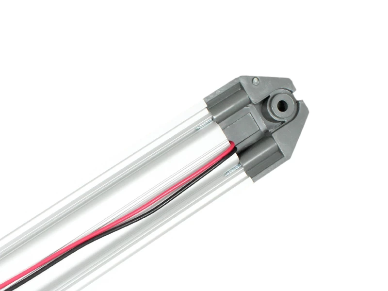 The housing has removable plastic caps to access the fixing holes and connection is via flying leads (+ve to red, -ve to black) that exit at the end of the light.