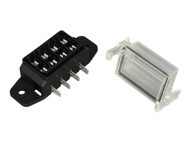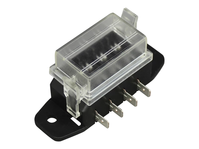 Low profile, 4 way standard blade fuse box with 6.3mm side entry blade terminals. Supplied with clear protective cover which clips into place (cover includes a sealing gasket). Fixing holes are located at the ends of the box for surface mounting.