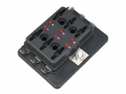 Low profile, 6 way standard blade fuse box with 6.3mm side entry blade terminals. Supplied with clear protective cover which clips into place (cover includes a sealing gasket). Fixing holes are located at the ends of the box for surface mounting.