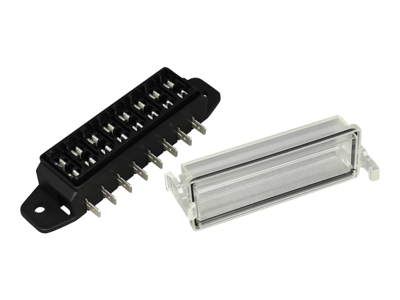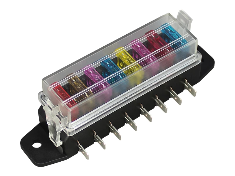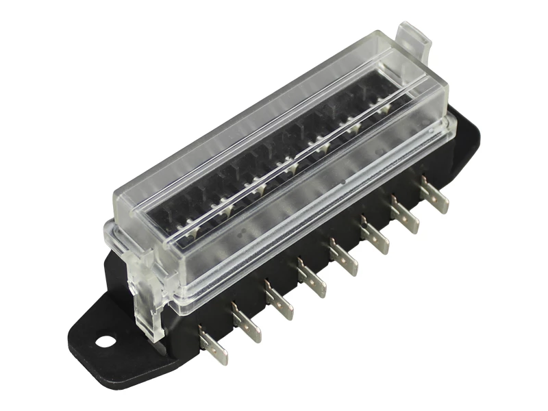 Low profile, 8 way standard blade fuse box with 6.3mm side entry blade terminals. Supplied with clear protective cover which clips into place (cover includes a sealing gasket). Fixing holes are located at the ends of the box for surface mounting.