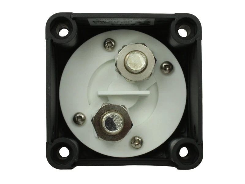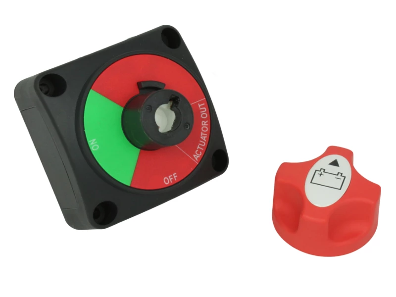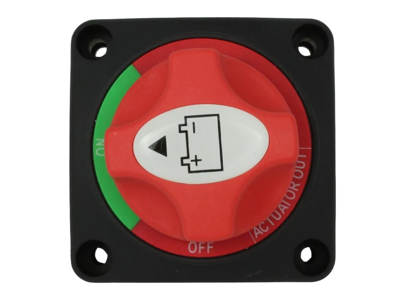 2 position (ON / OFF), single pole marine battery isolator / master switch rated at 200A continuous use. This switch has a very nice, positive switching action and the actuator knob can be removed by pushing it in and rotating it to the ‘Actuator Out’ position; providing a useful security measure.
