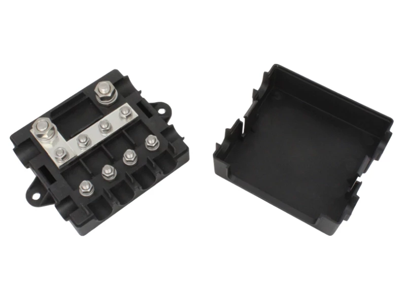 Compact and tough fuse box for distributing power to multiple electrical systems around a vehicle. The main feed in is to a mega fuse location which then feeds a further 4 midi (or strip) fuse locations via 2 copper strips. The box features a tethered, snap-on lid for quick and easy access.