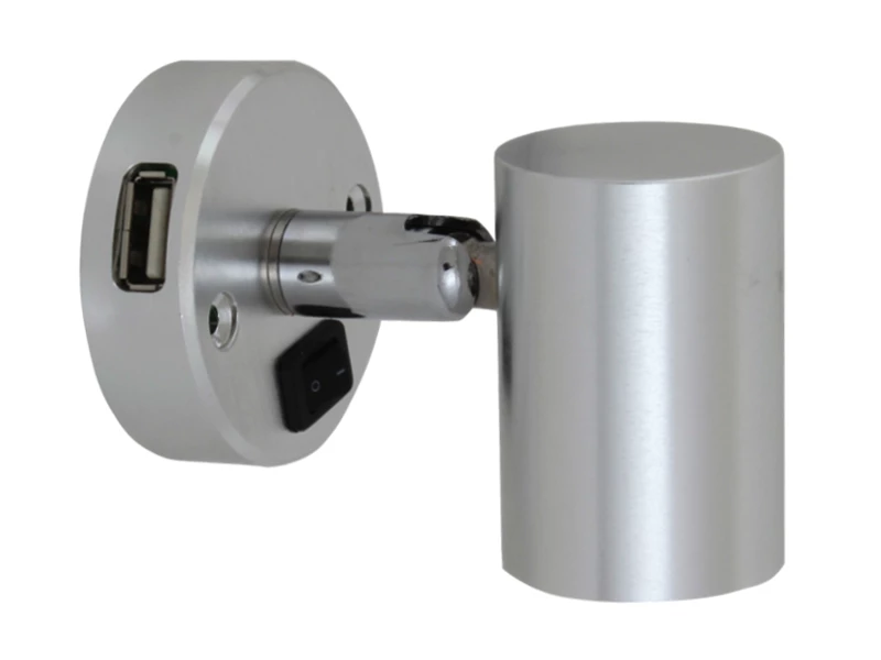 Minitube 12V miniature spot light with built-in USB charging socket, for use in motorhomes, vans, campervans, caravans, boats etc. Brushed aluminum body featuring a 34mm diameter tilt and swivel head (approx. 330° swivel and 90° tilt) with a black on/off switch. The lens is frosted to provide a softer lighting effect.