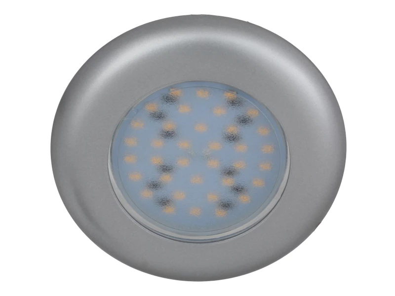 Nova 12V LED downlight in matt silver with surface mounted LEDs totalling 1.3W (equivalent effect to an 8W halogen bulb). These low profile lights are ideal for mounting in head linings in caravans, motorhomes, campervans and boats thanks to their shallow depth. They protrude only 14mm behind the mounting face, and the visible part of the light is only 6mm deep.