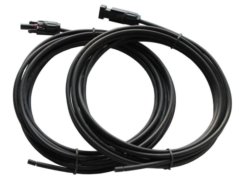 A pair of solar-specific, UV-resistant cables with a 4mm² conductor cross-section. Supplied as 2 x 5m lengths with one end of each cable terminated with a solar connector (male and female) and the other end left un-terminated. The solar connectors are MC4-compatible.