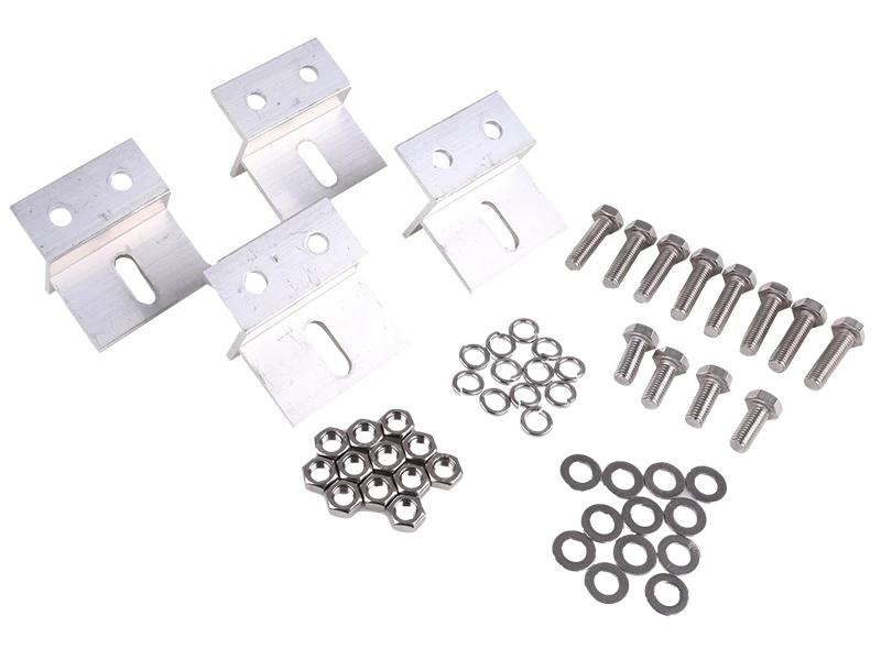 Set of 4 aluminium mounting brackets and stainless fixings for securing rigid framed solar panels to the roofs of motorhomes, caravans, boats or buildings. Provides a strong and secure fixing and fits most panels that are built into an aluminium frame.