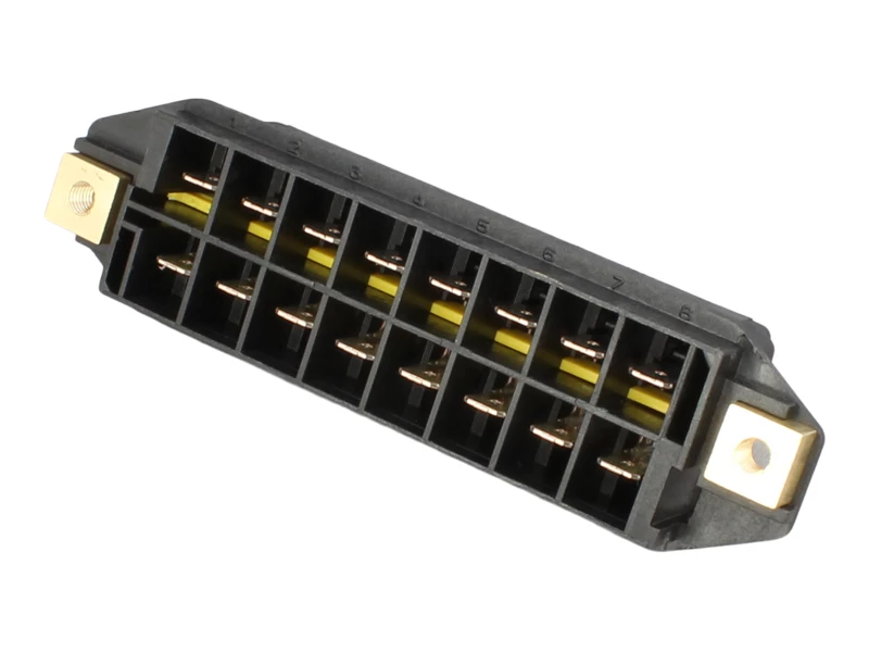 8 way standard blade fuse box with 6.3mm blade terminals mounted on the underside of the box. This fuse box is designed specifically for use in panels and incorporates brass inserts with M5 threads for mounting .