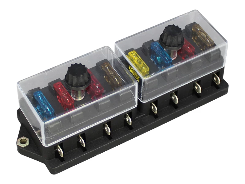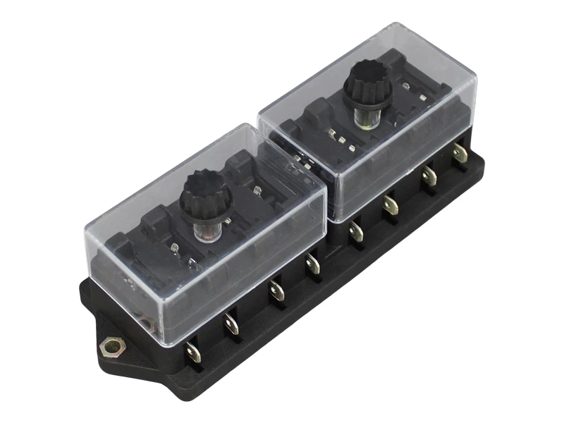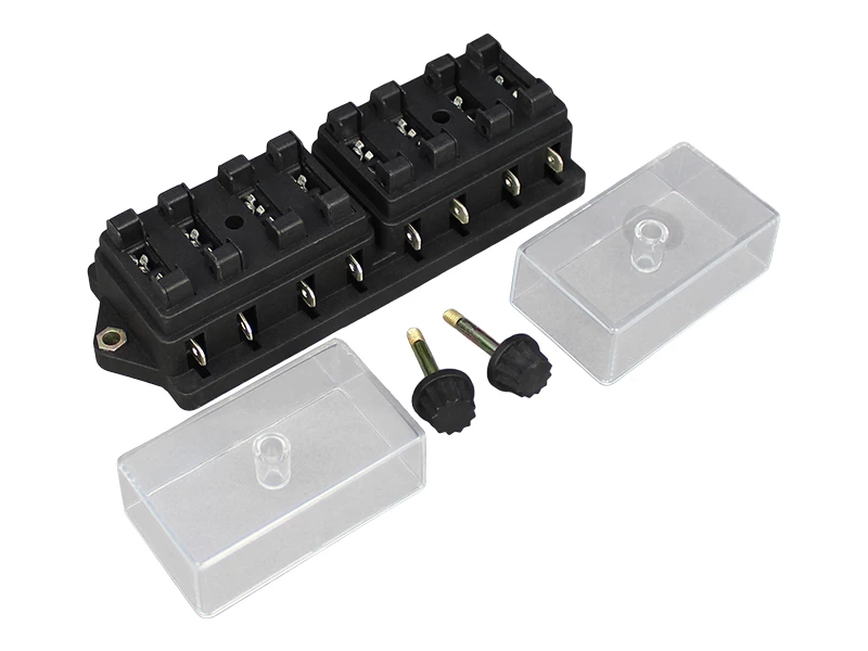 8 way standard blade fuse box with 6.3mm side entry blade terminals. Supplied with 2 x clear protective covers which are secured using thumb screws. Fixing holes are located at the ends of the box for surface mounting.