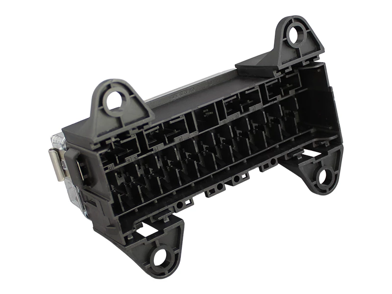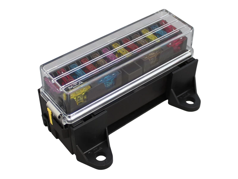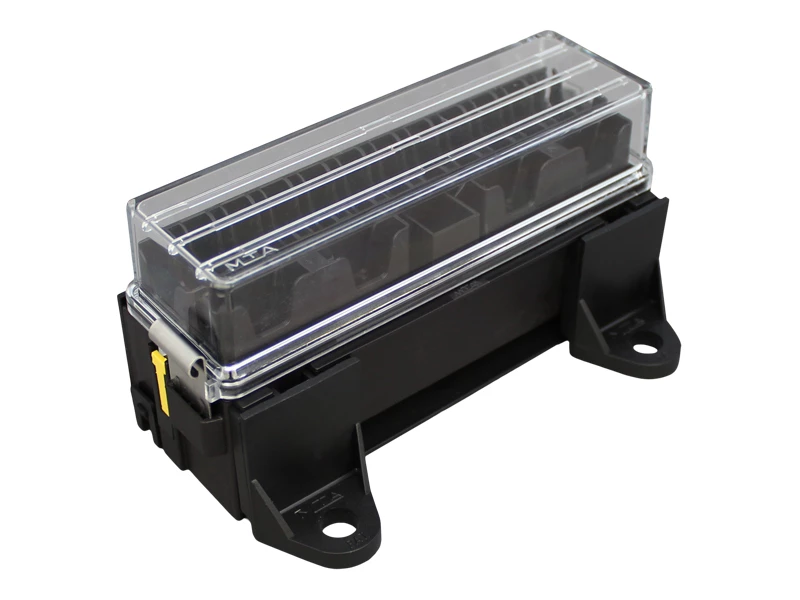16 way fuse box with connections on the underside of the box, for standard blade fuses. Includes clip-on clear protective cover (with gasket), bottom cover and terminal locking bars. Fixing holes are located on the four removable feet along the sides of the box. Box includes storage area for fuse extraction tool P00504 (available separately).