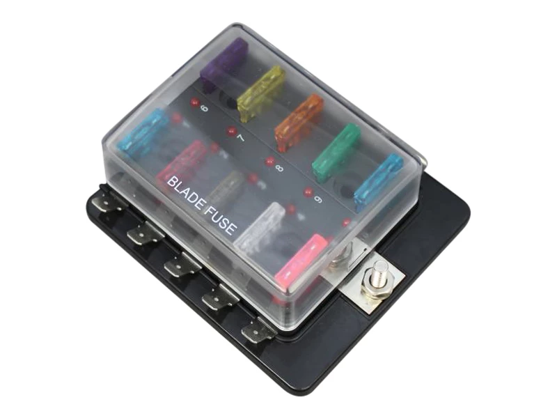 10-way standard blade fuse box with individual LEDs that light to indicate when a fuse has blown. Power input is via a common stud feeding each of the 10 circuits and the output connections are 6.3mm blade terminals on the sides of the unit. Supplied with a clear protective cover that clips into place and the base has 4 fixing holes for surface mounting.