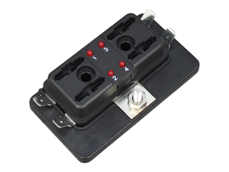4-way standard blade fuse box with individual LEDs that light to indicate when a fuse has blown. Power input is via a common stud feeding each of the 4 circuits and the output connections are 6.3mm blade terminals on the sides of the unit. Supplied with a clear protective cover that latches into place and the base has 2 fixing holes for surface mounting.