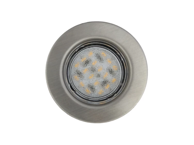 Vega 48 round recessed 12V downlight with 18 surface mounted LEDs totalling 0.6W (equivalent effect to a 4W halogen bulb) suitable for use in motorhomes, vans, campervans, caravans, boats etc. These 48mm diameter miniature, flush fitting, recessed lights have a bushed steel finish and feature an easy ‘no-screw’ mounting system – they simply push into a 40mm dia hole in a panel or headlining of 5mm thick or greater and the rubber ring around the light grips it in place. They provide a very discrete and extremely low profile finish and the lens is frosted to provide a softer lighting effect.