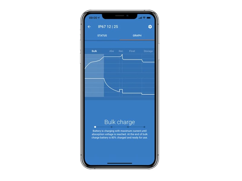 The built-in Bluetooth allows you to monitor the status of your charger via any Android or Apple device and all settings of the charger can be configured with the VictronConnect app.