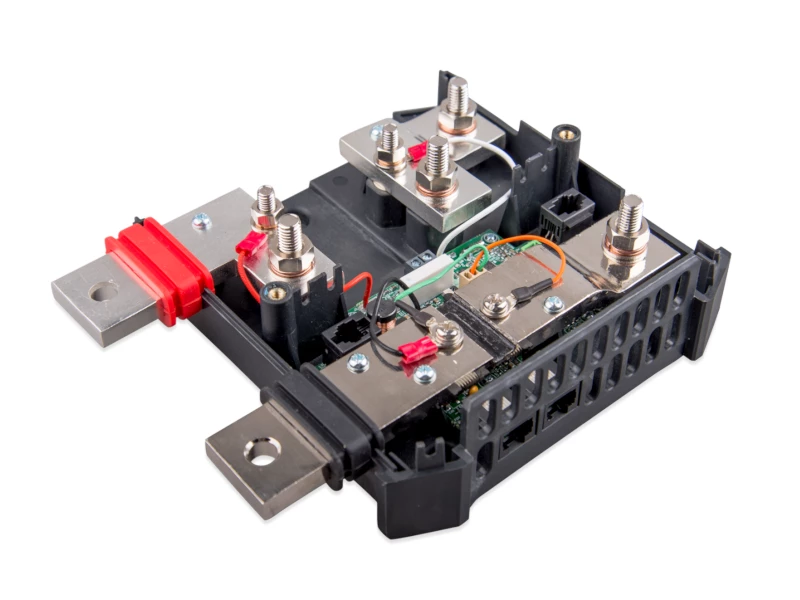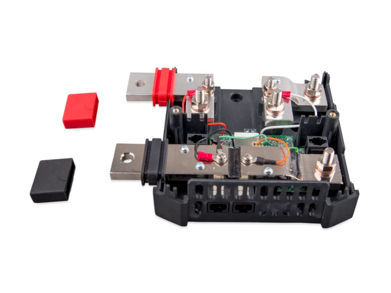Inside the Lynx Shunt VE.Can there are positive and negative busbars, a shunt and a main system fuse location that can hold a CNN or ANL type fuse. The busbars enable a continuous connection with other connected Lynx modules and the fuse is monitored, turning the power LED red and sending an alarm message to the GX device if it blows. The module also features an alarm relay which can be programmed via a GX device to activate under certain conditions (battery state of charge, battery voltage, battery temperature, blown main system fuse).