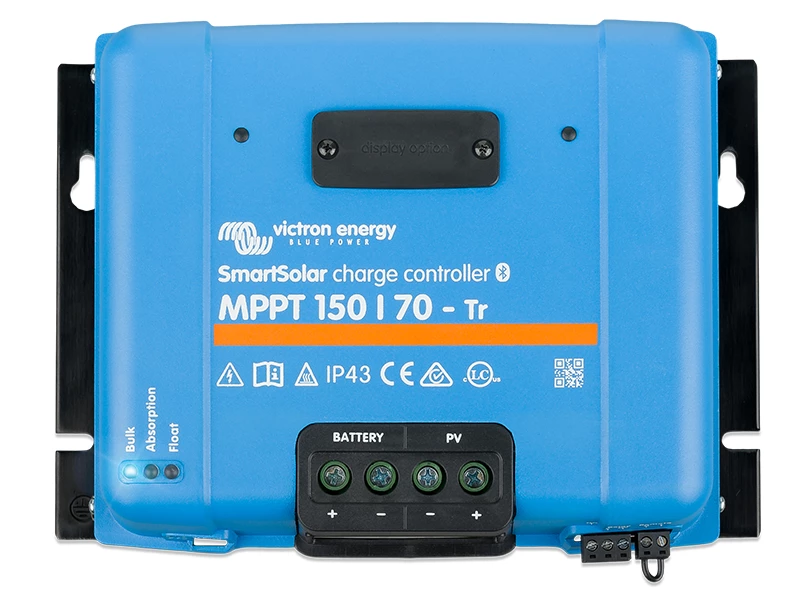 The SmartSolar MPPT 150/70-Tr is capable of working with 12, 24, 36 & 48V systems and auto selects on detection of the battery voltage (software tool needed to select 36V). There is also an optional SmartSolar ‘pluggable’ display available that attaches to the front of the controller and provides a wide range of data related to charging performance of the solar system, as well as enabling you to configure various controller settings. This display can be fitted permanently or used temporarily.