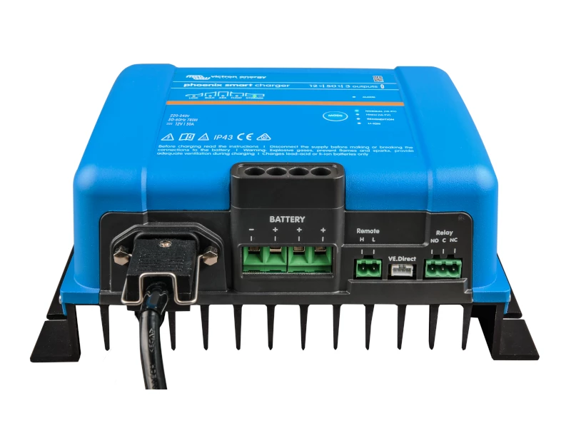 The Phoenix Smart IP43 Charger range has all of the technology you have come to expect from Victron, with built-in Bluetooth, 5-stage adaptive charge algorithm and a host of other features. This 12V high output version has 3 full-rated charging outputs, with each capable of delivering 50A to a battery (or bank of batteries) when used on its own, or with the 50A shared between the outputs if more than 1 is used. This setup is ideal for use on boats, enabling you to charge your house, starter and bow-thruster (or windlass) batteries from one charger.