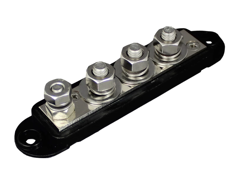 4 point power distribution block/busbar from VTE that allows the connection of multiple negative return lines to a single cable in vehicles and on boats.