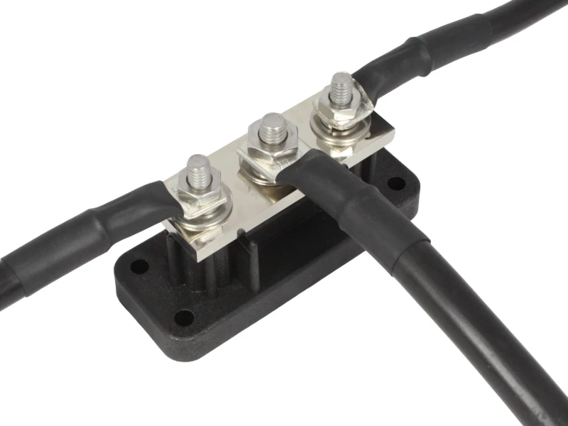 The terminal posts are 1 x 9.4mm dia. and 2 x 7.9mm dia. and the busbar body is secured via four mounting holes.